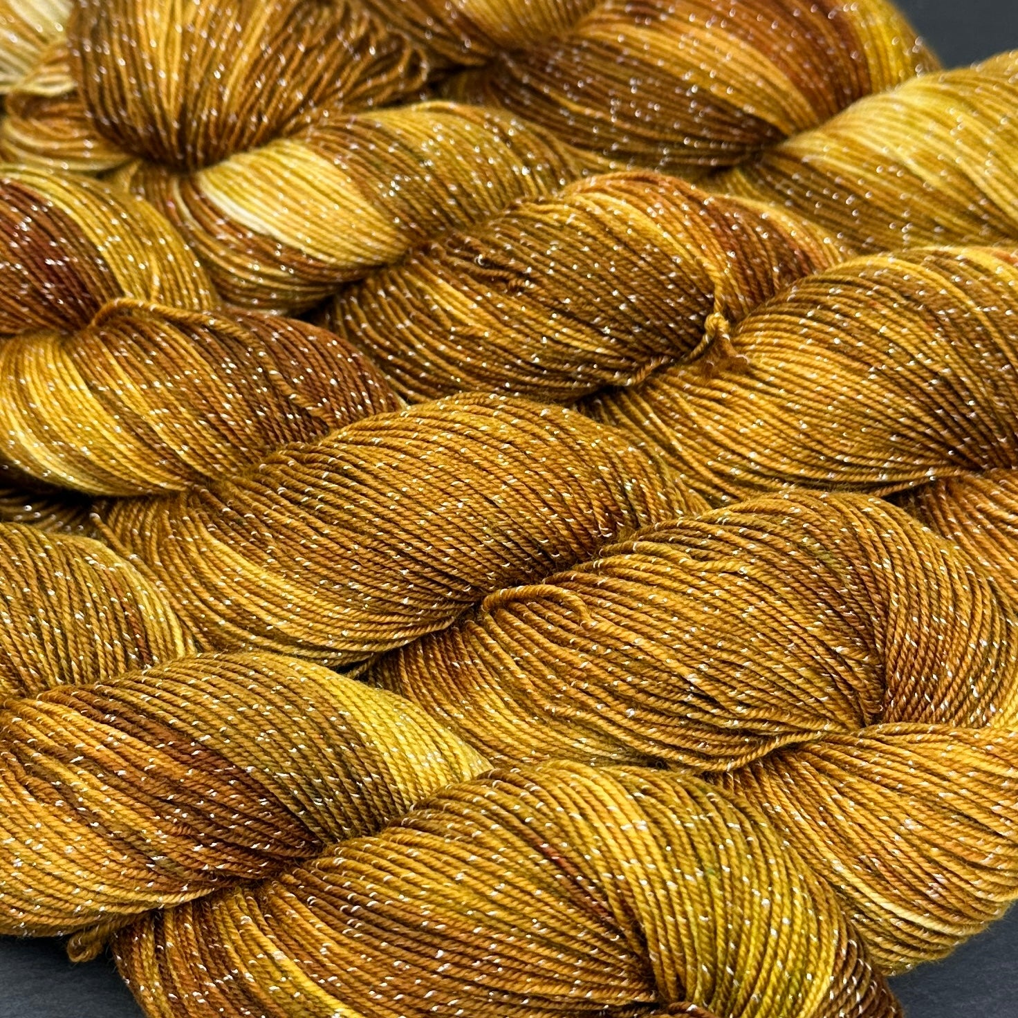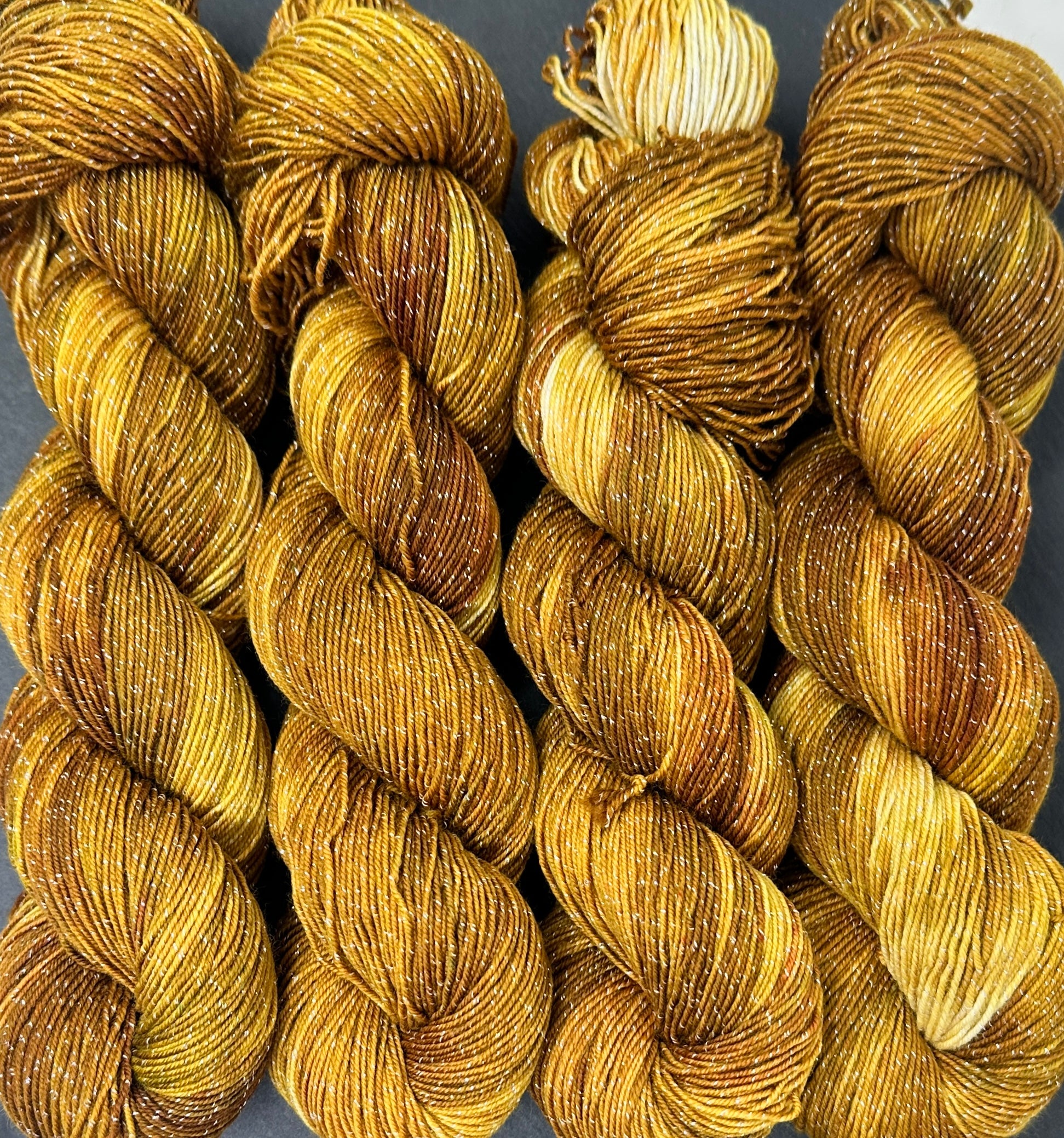 Each skein is 4 ounces and 405 yarns of high twist super wash merino plied with a Lurex thread. Figment is fabulous for shawls, fine knits, and socks due to the high twist of the merino.